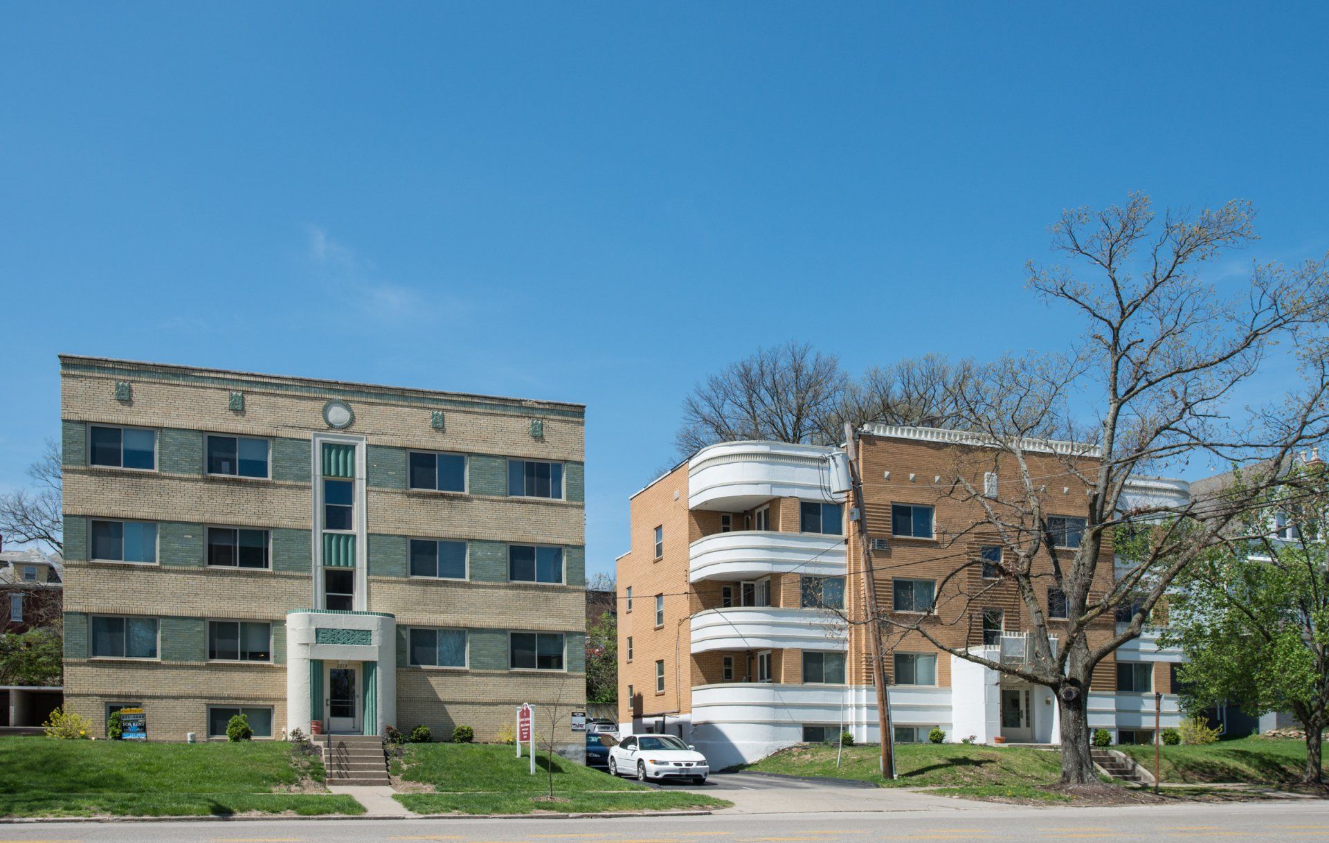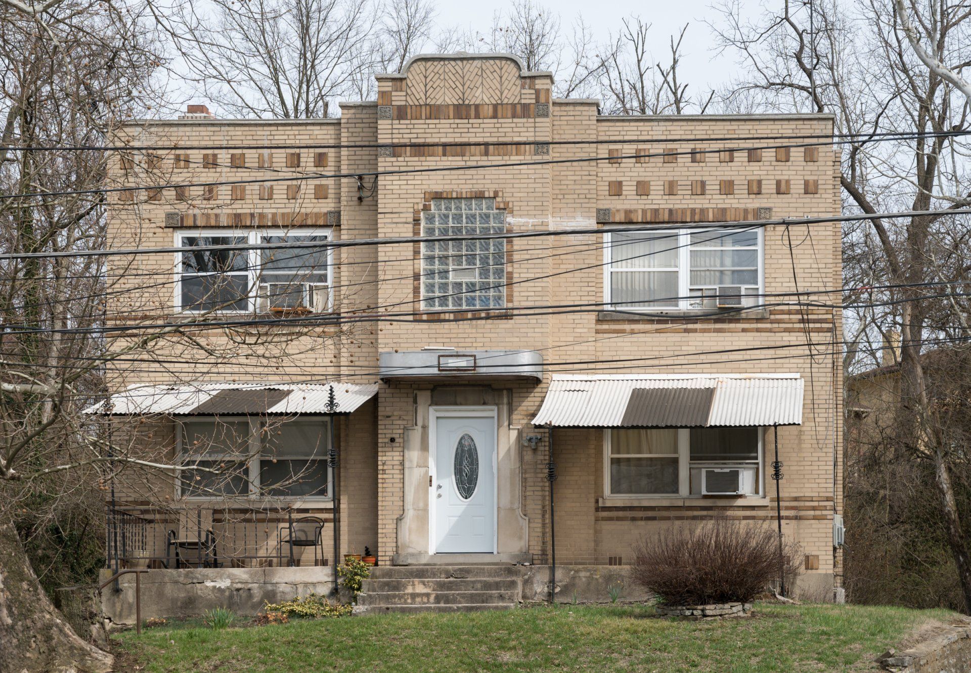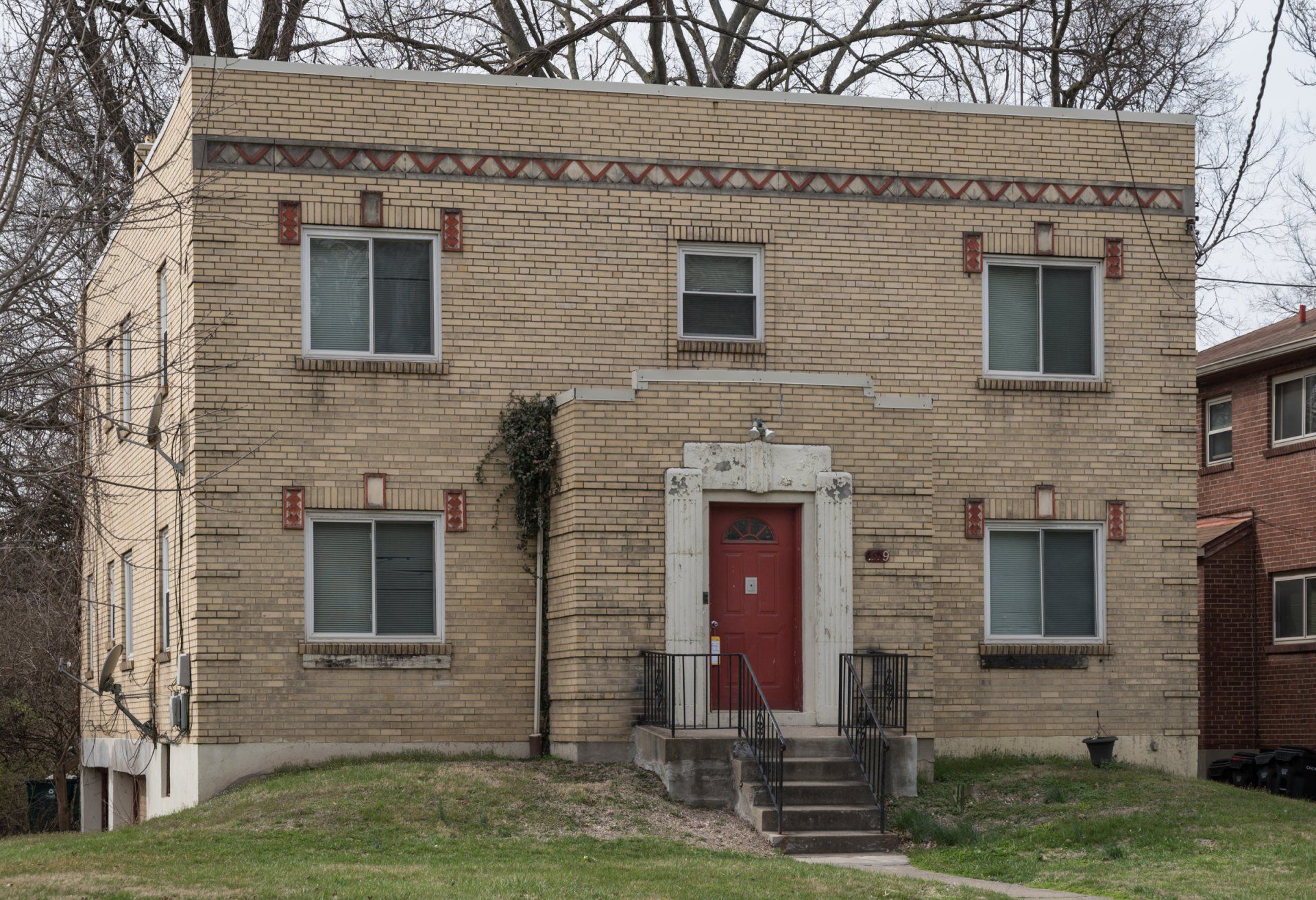 In the city’s second-ring, “streetcar suburbs” such as Clifton, Hyde Park and Walnut Hills, apartment houses—some quite substantial, multi-story structures--were built along the main thoroughfares such as Clifton Avenue, Madison Road and Victory Parkway beginning in the early 20th century. While many exhibit traditional styles such as Georgian or Tudor Revival, or reflect no particular style, a select few exhibit modest to full-blown Art Deco detailing. An excellent example of the latter is 2109 Luray Avenue (1939) in Walnut Hills. Built in the 1930s, the three-story brick building facing Eden Park features curved balconies, main entrances flanked by glass block sidelights and glazed sconces, and geometrical iron railings at the front steps and rooftop terrace.