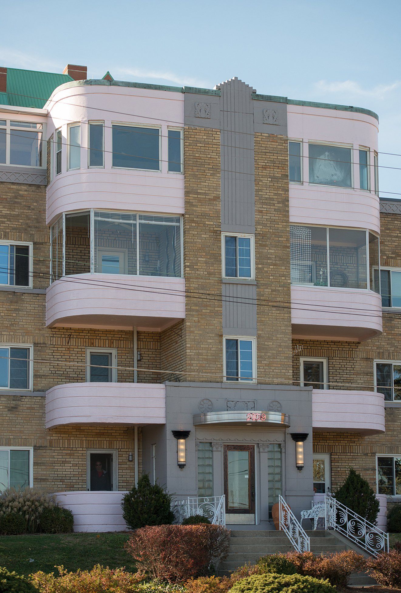 The most common manifestations of Art Deco influence in Cincinnati are the fourplex apartments built in large numbers in outlying “automobile suburbs” that saw extensive development in the mid-20th century, such as Westwood, Roselawn, Bond Hill, West Price Hill and Oakley. These two-story, four-unit brick buildings typically exhibit simple design and symmetrical facades, with minimal Deco detailing at the front entrance and sometimes at the rooftop parapet. Many were built with steel casement windows that have since been replaced.