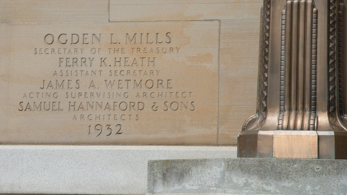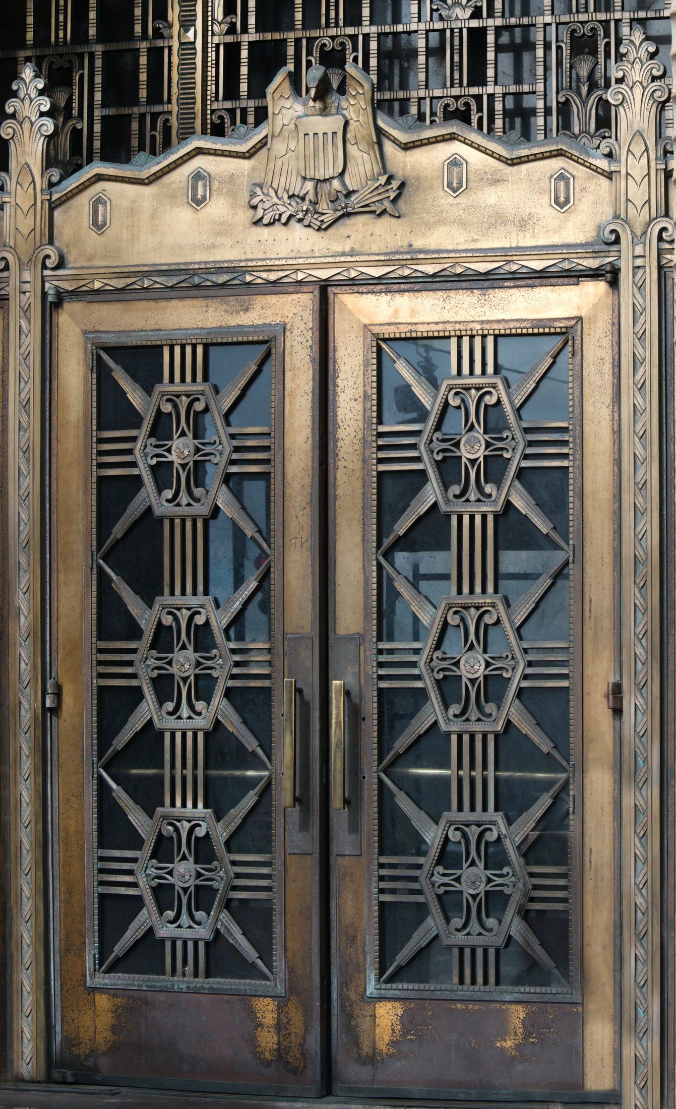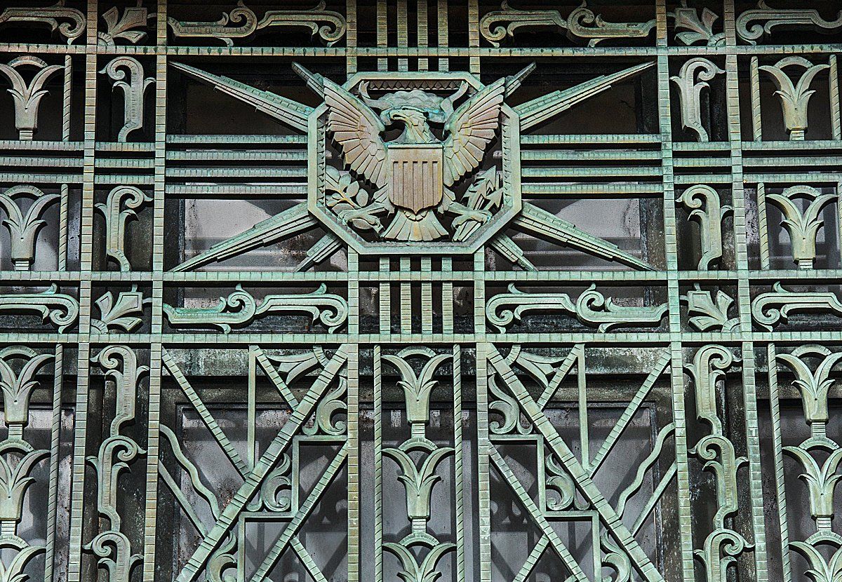 Beginning in 1930, the federal supervising architect’s office began to hire private architects for some of their larger projects. Such was the case with the post office’s Dalton Street Annex. The Dalton Street post office is “an excellent example of Depression Modern, with its smooth sandstone walls punctuated by elongated recessed openings creating the effect of a colonnade on the long façade…. Pylon-shaped light standards and bas reliefs of American eagles dramatize the doorways. Other decorative elements include bronze doors and grilles, marble floors and wainscoting, and elaborate Moderne light fixtures” (Sue Ann Painter, Architecture in Cincinnati: An Illustrated History of Designing and Building an American City [Ohio University Press, in association with the Architectural Foundation of Cincinnati, 2006], p. 201).