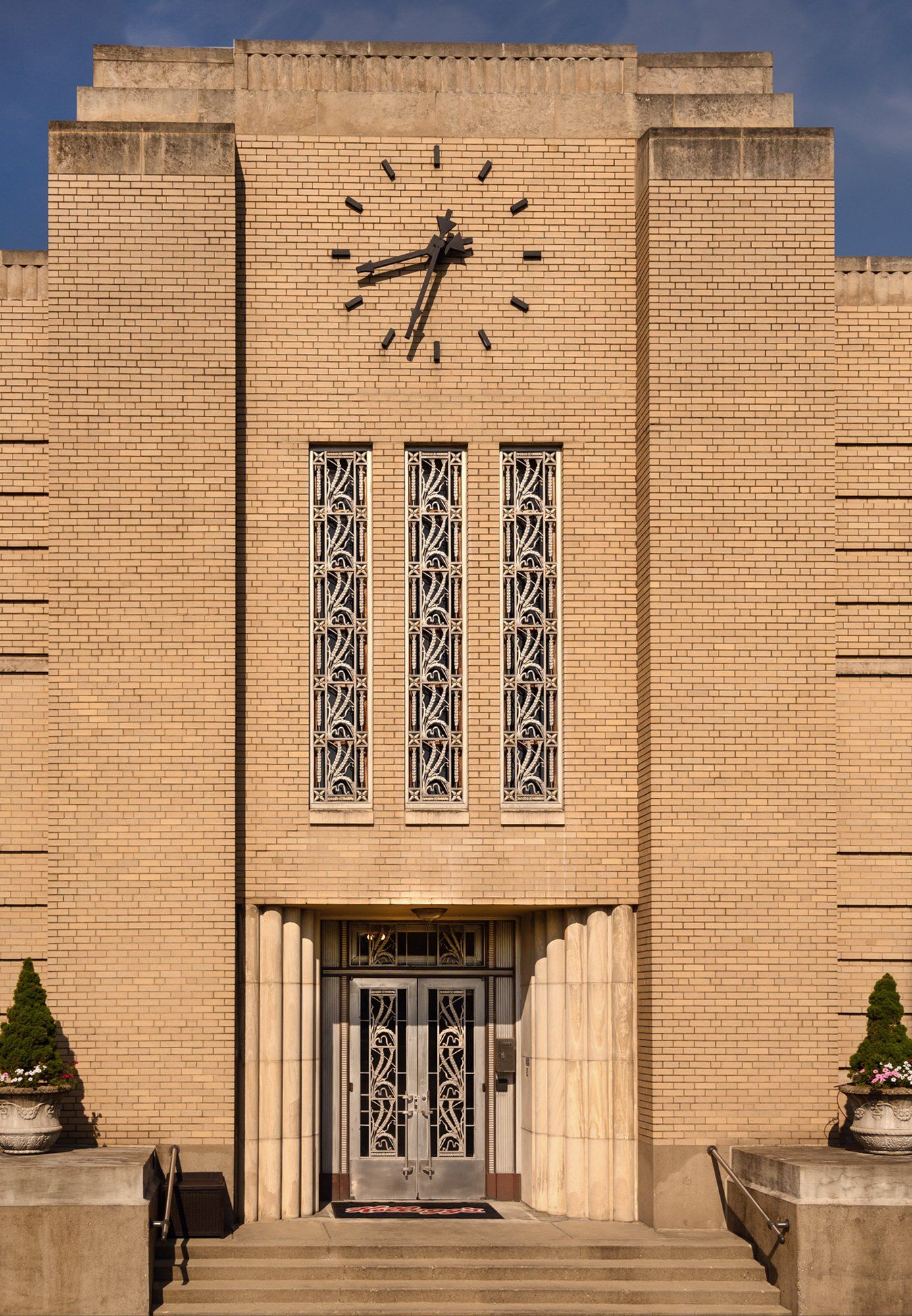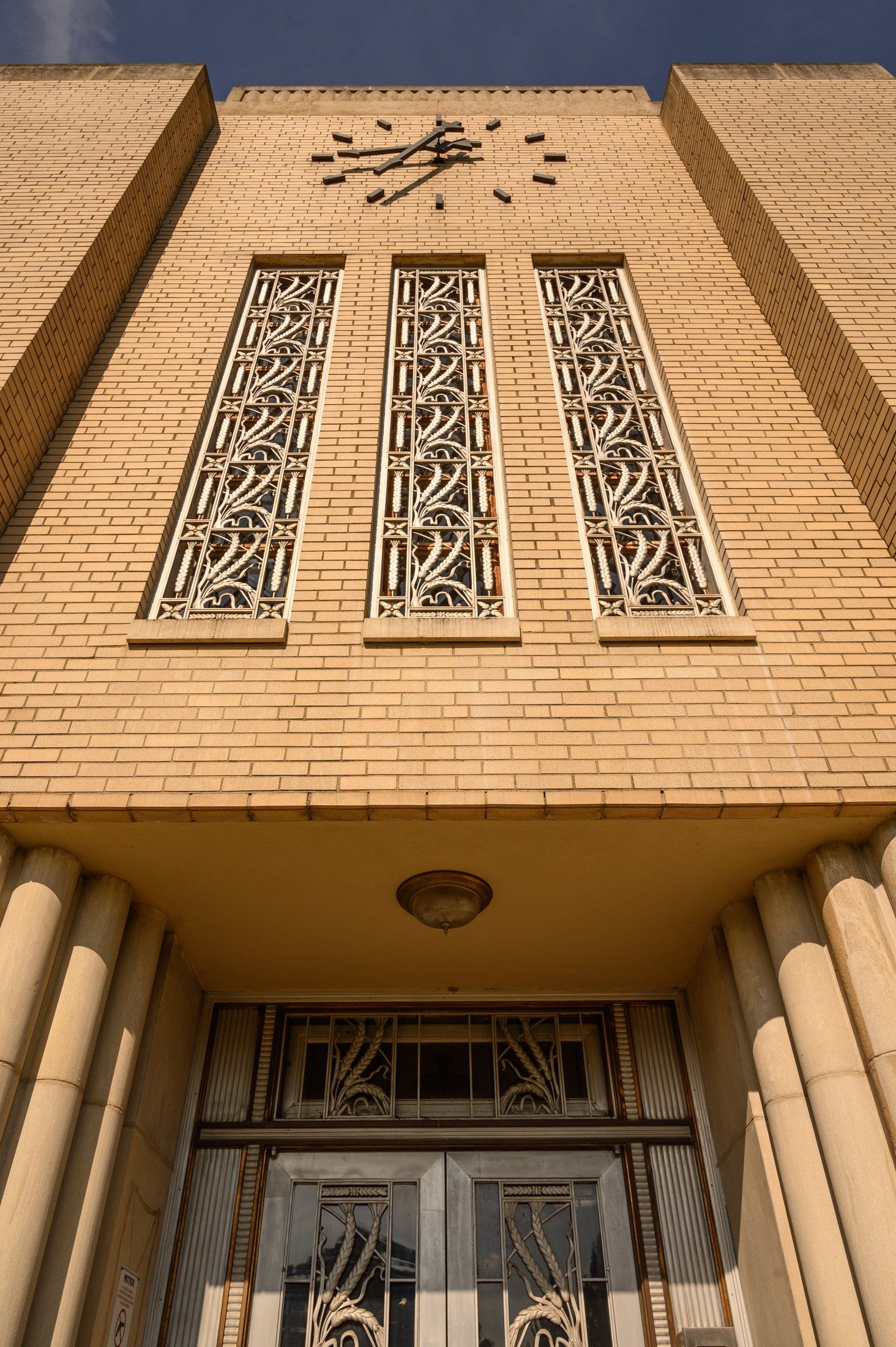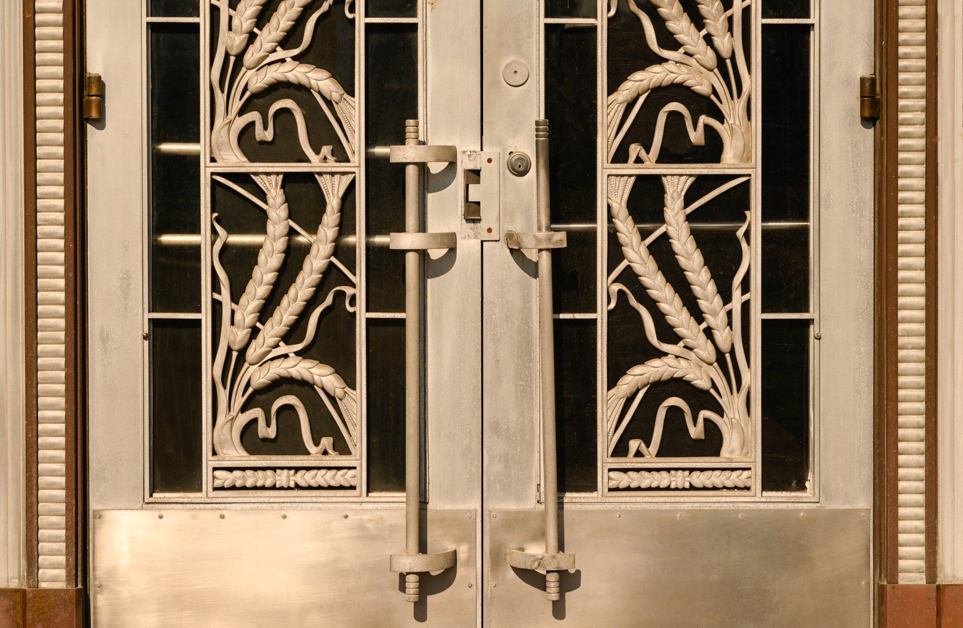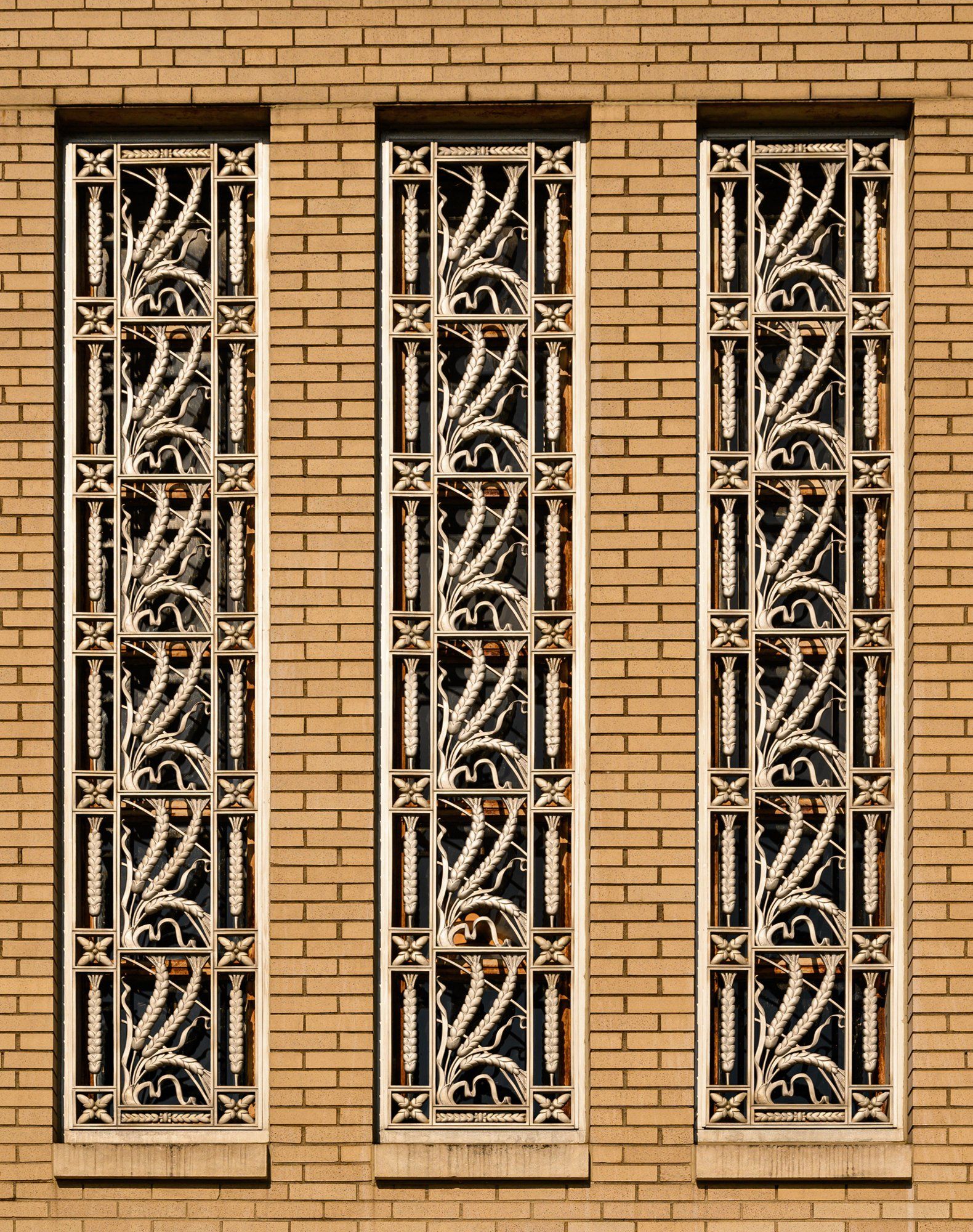 The cast aluminum decorative element of a wheat motif can be found on the main entry doors and in a large decorative panel on the buildings facade. Deeken also designed the Coca-Cola Bottling Plant.