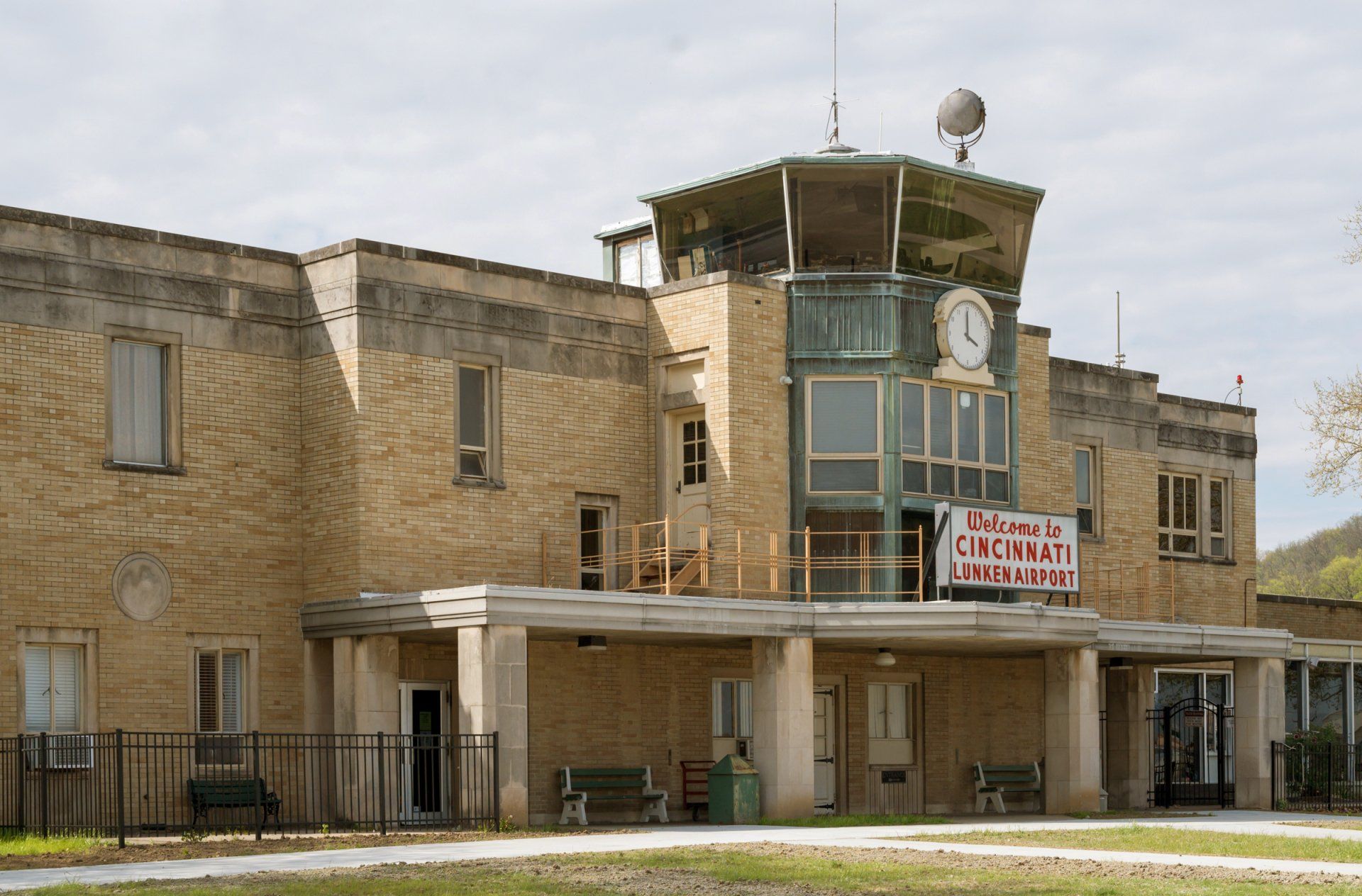 Construction of the Lunken terminal, which contains the control tower, began in 1936: a stylized yellow brick building with semi-hexagonal tower, exhibiting restrained Art Moderne influence.