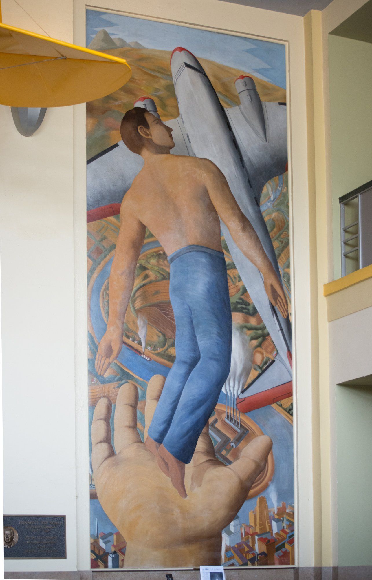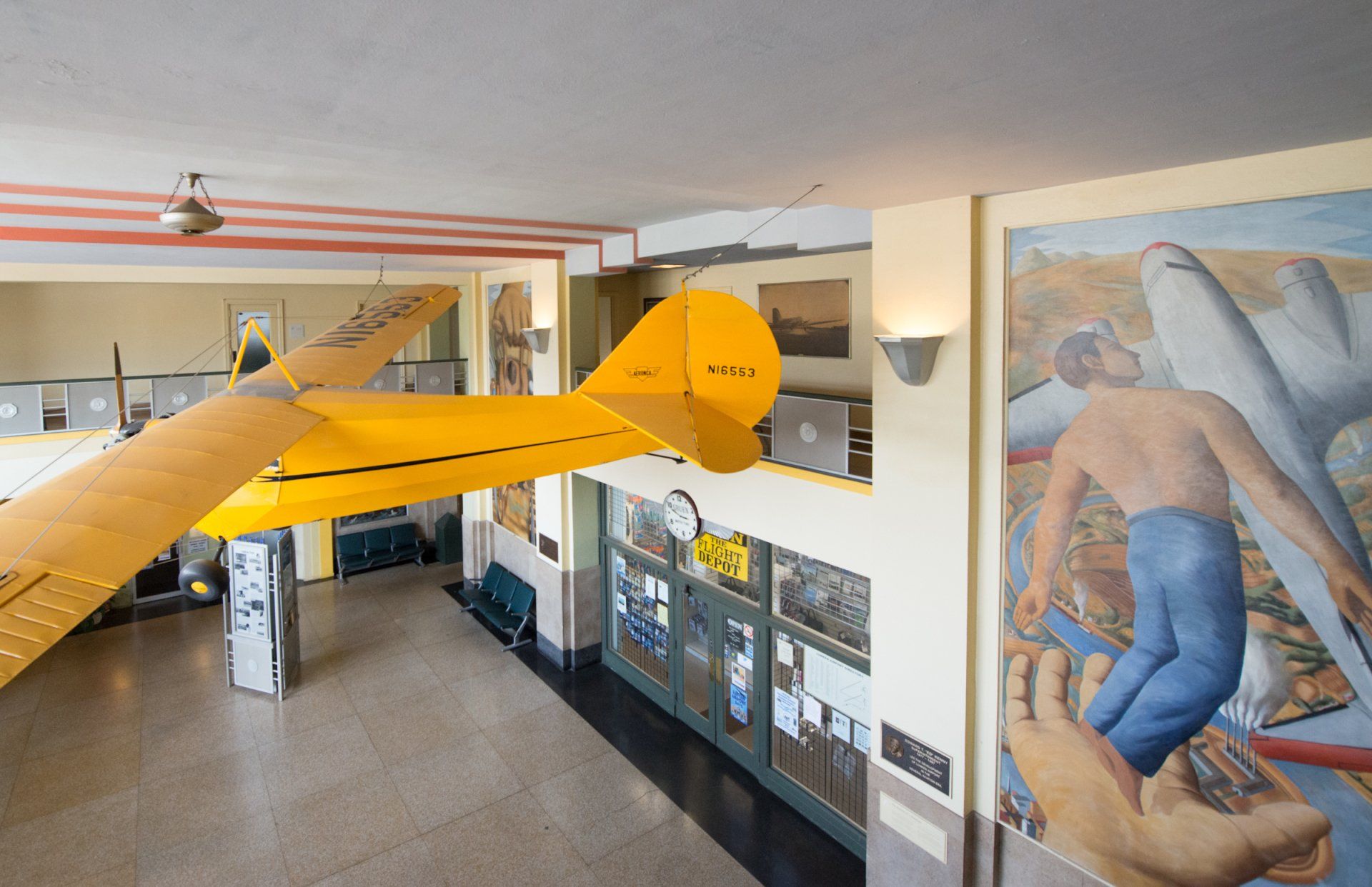 After World War I, Edward H. Lunken and US Army Major E.L. Hoffman envisioned a permanent airfield on the property. In the late 1920s, Lunken agreed to donate the facility to the City if it would agree to expanding and improving it. A bond issue was passed and the City purchased additional land to enlarge the airport. Later, New Deal programs helped fund further improvements, including artist William Harry Gothard’s stylized murals depicting man “uplifted by the power of flight” or, conversely, held down by gravity. Winners in a Federal Art Project competition, both artworks remain in place today. Gothard later became the chief conservator of the Cincinnati Art Museum.