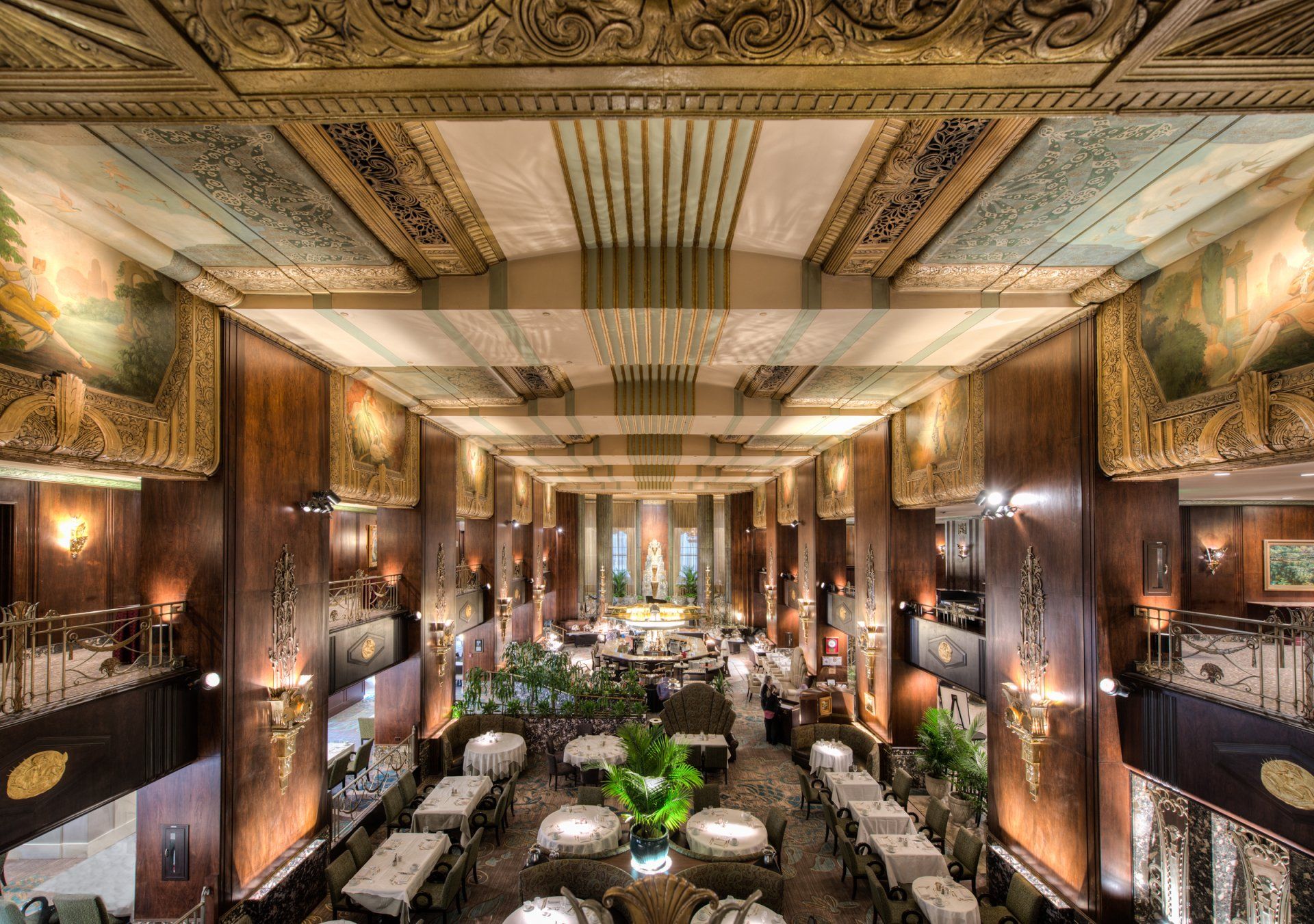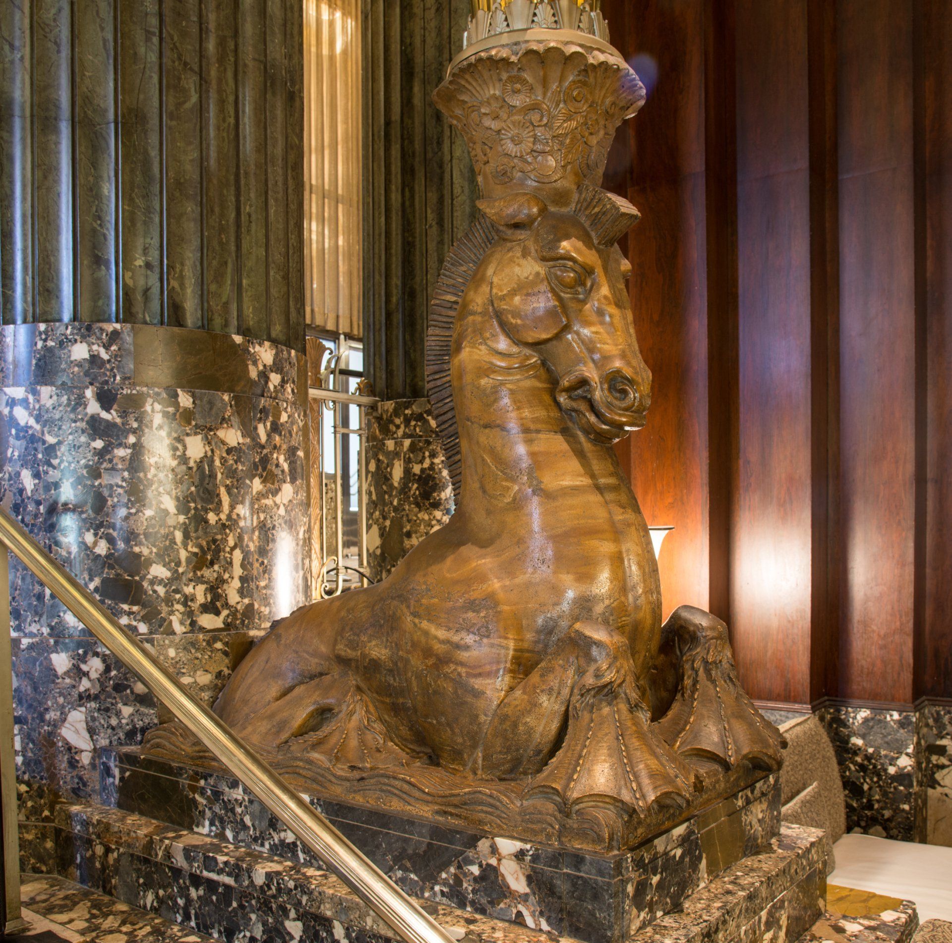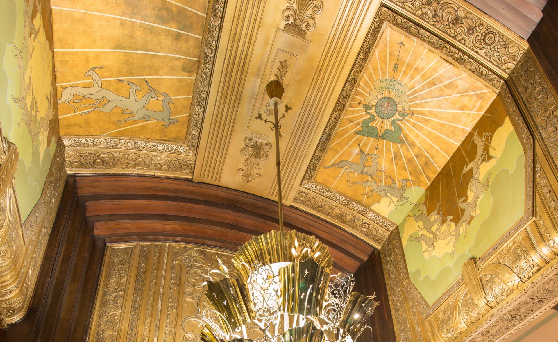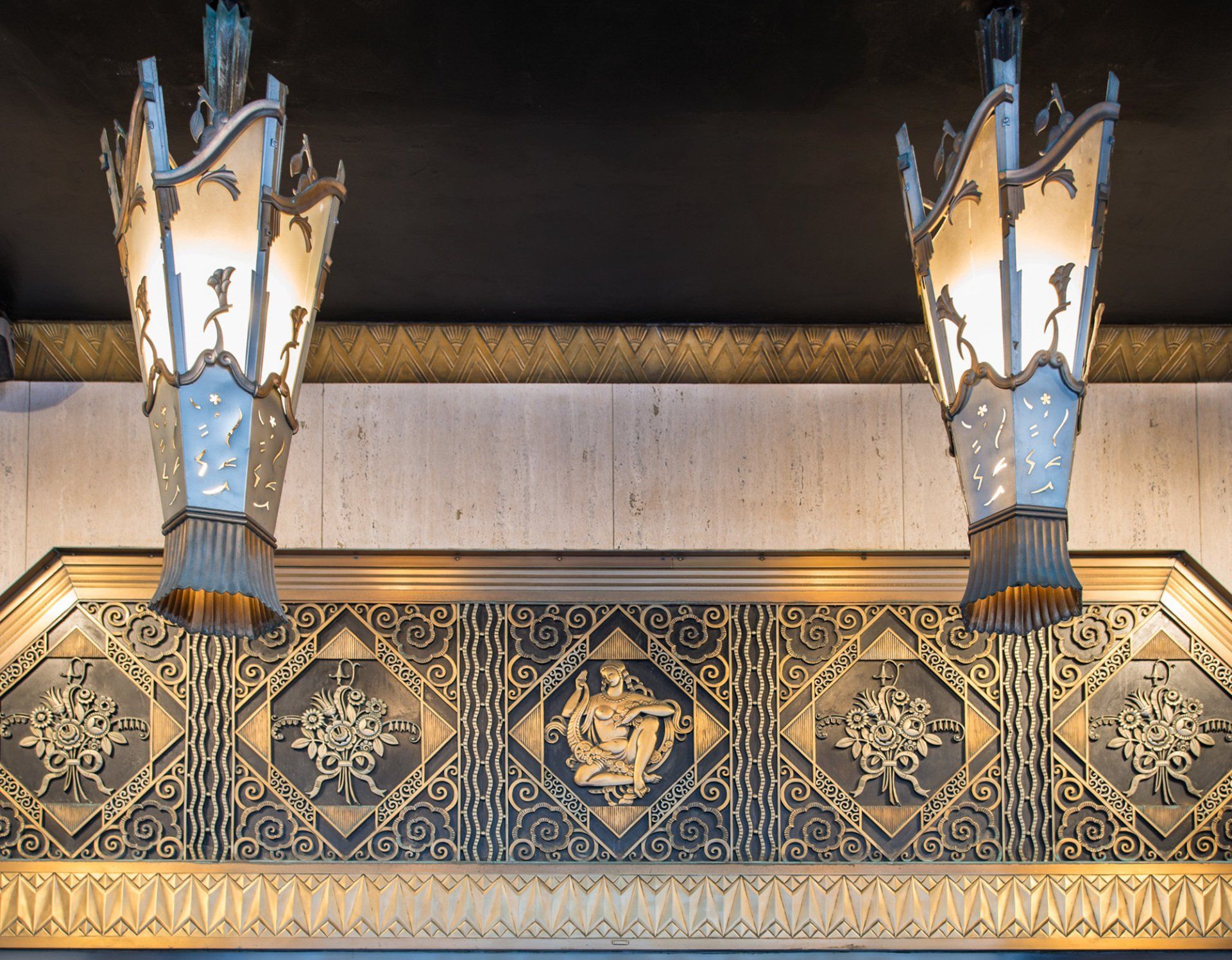 The Hall of Mirrors banquet hall was inspired by the Hall of Mirrors at the Palace of Versailles. Art Deco themes can be seen throughout, particularly in metalwork and grillework, Rookwood pottery floral tiles adorn the east and west entrances. New York architectural sculptor Rene Paul Chambellan executed sculptures on the interior and exterior of the building.