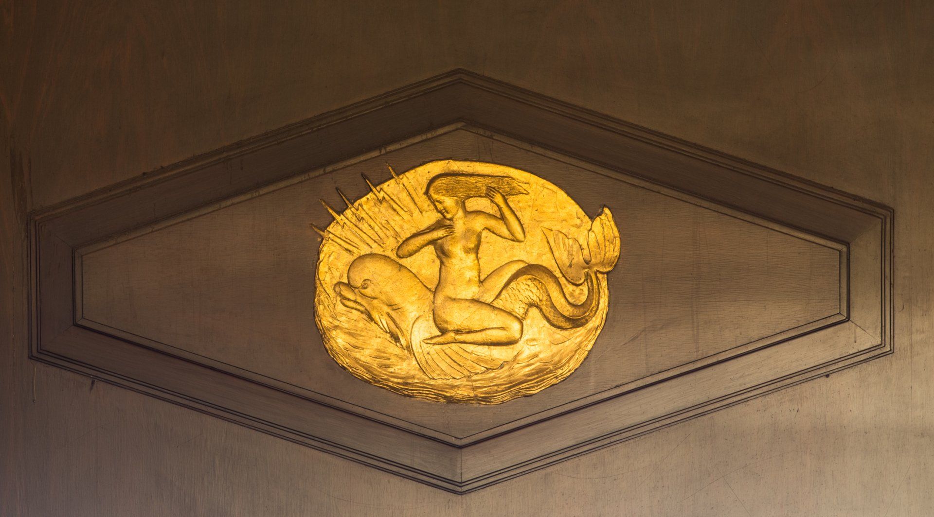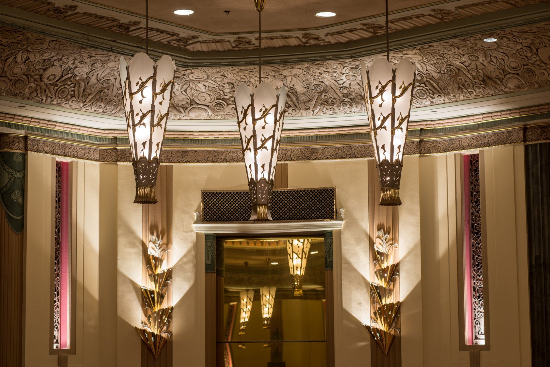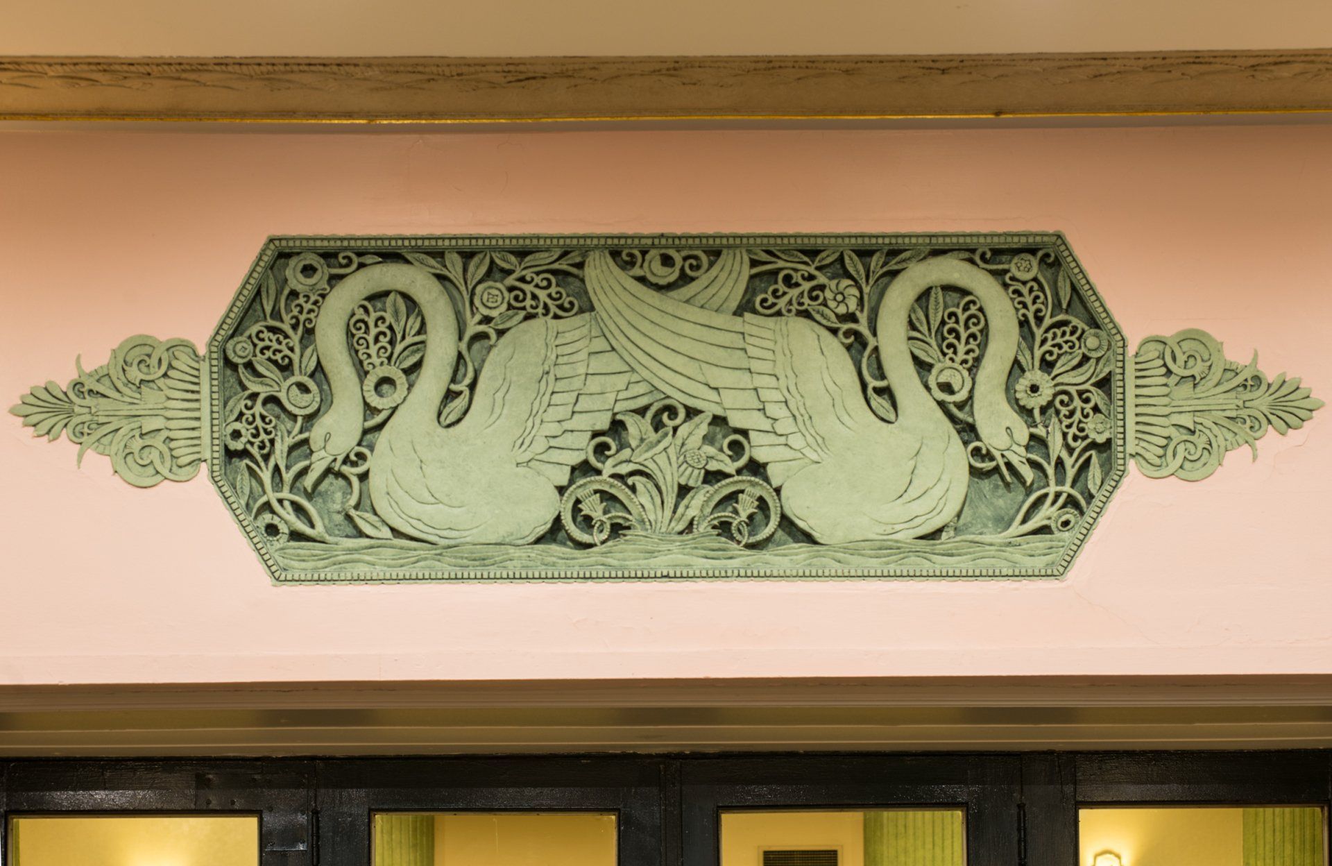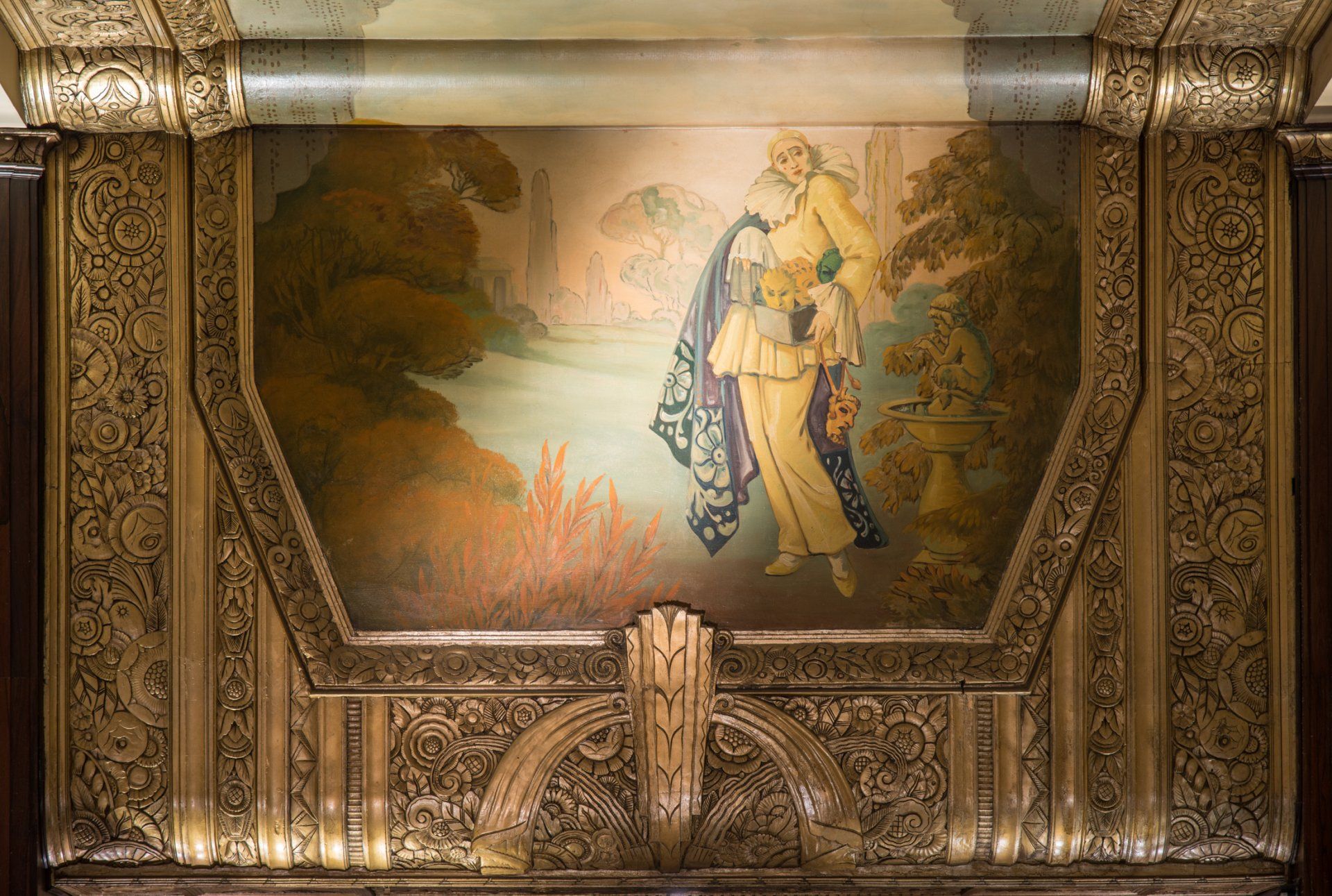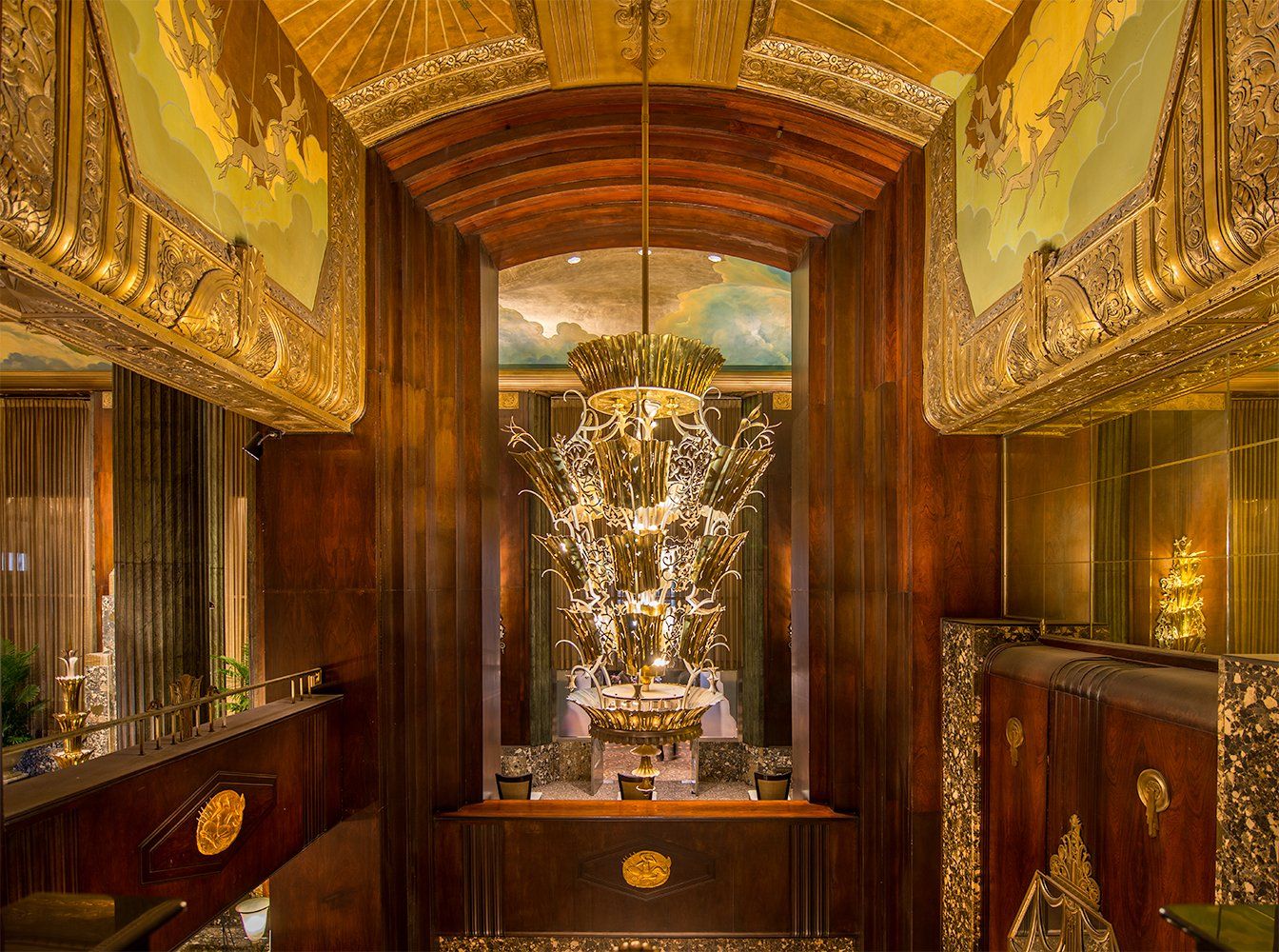 The Hall of Mirrors banquet hall was inspired by the Hall of Mirrors at the Palace of Versailles. Art Deco themes can be seen throughout, particularly in metalwork and grillework, Rookwood pottery floral tiles adorn the east and west entrances. New York architectural sculptor Rene Paul Chambellan executed sculptures on the interior and exterior of the building.