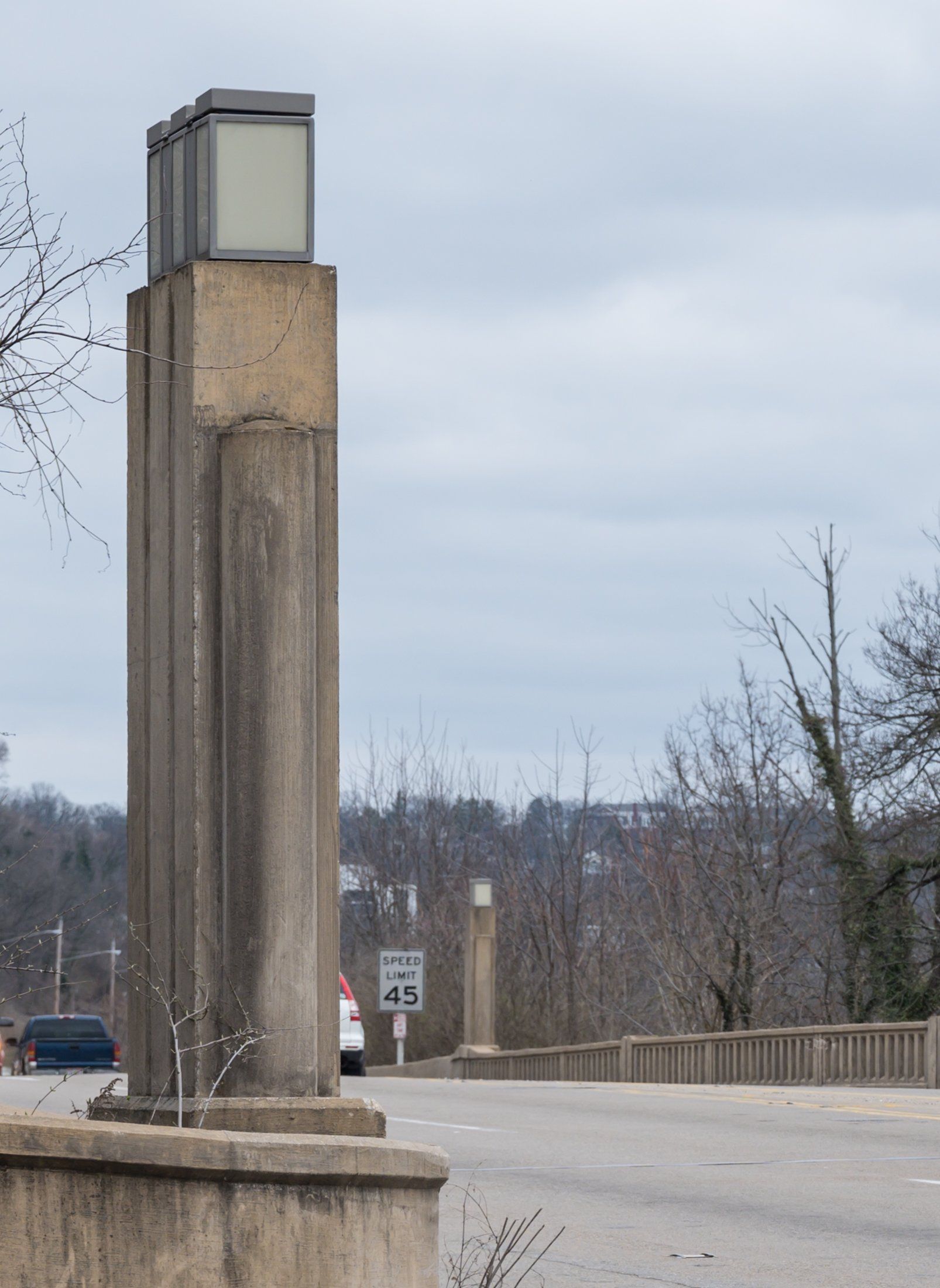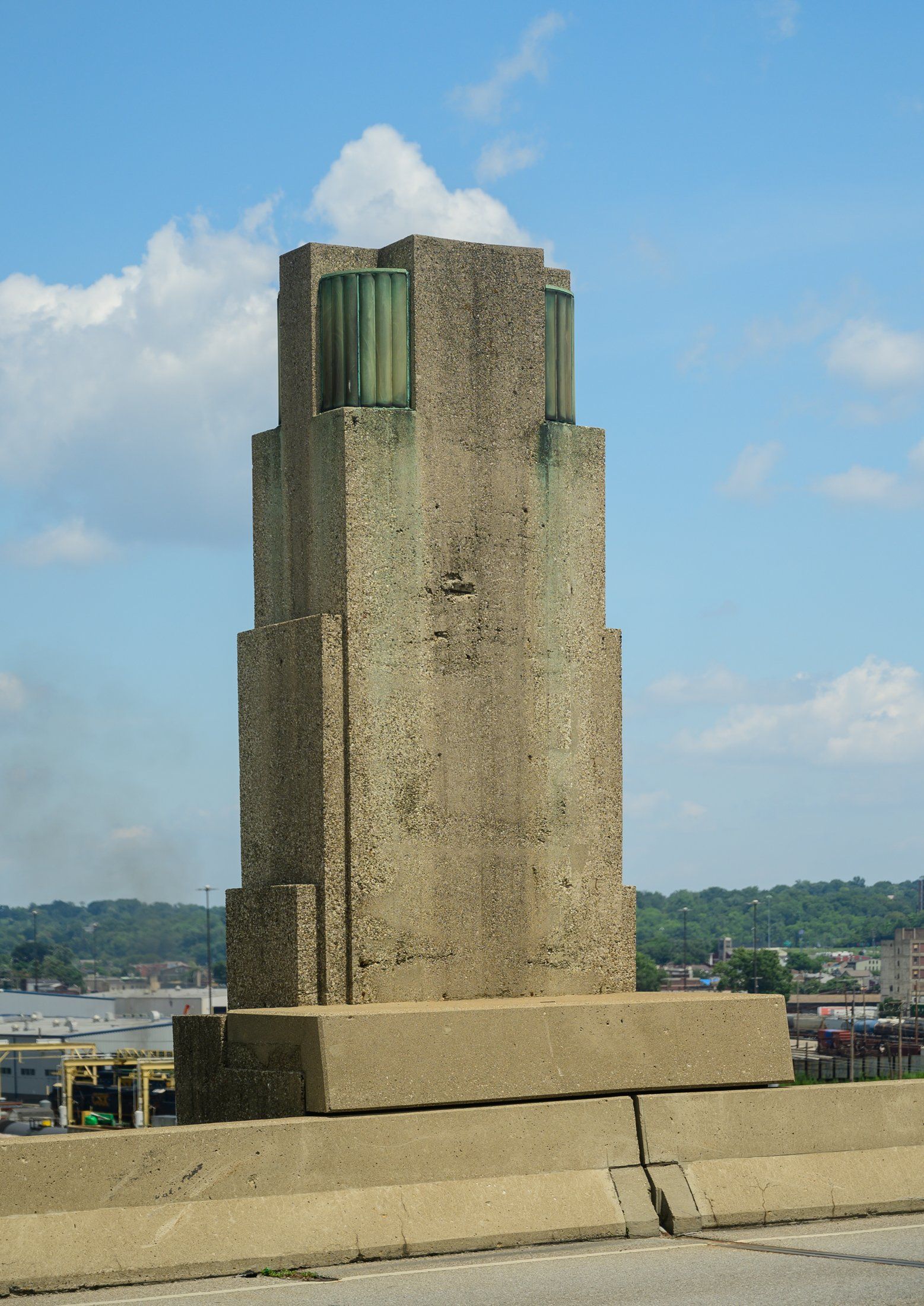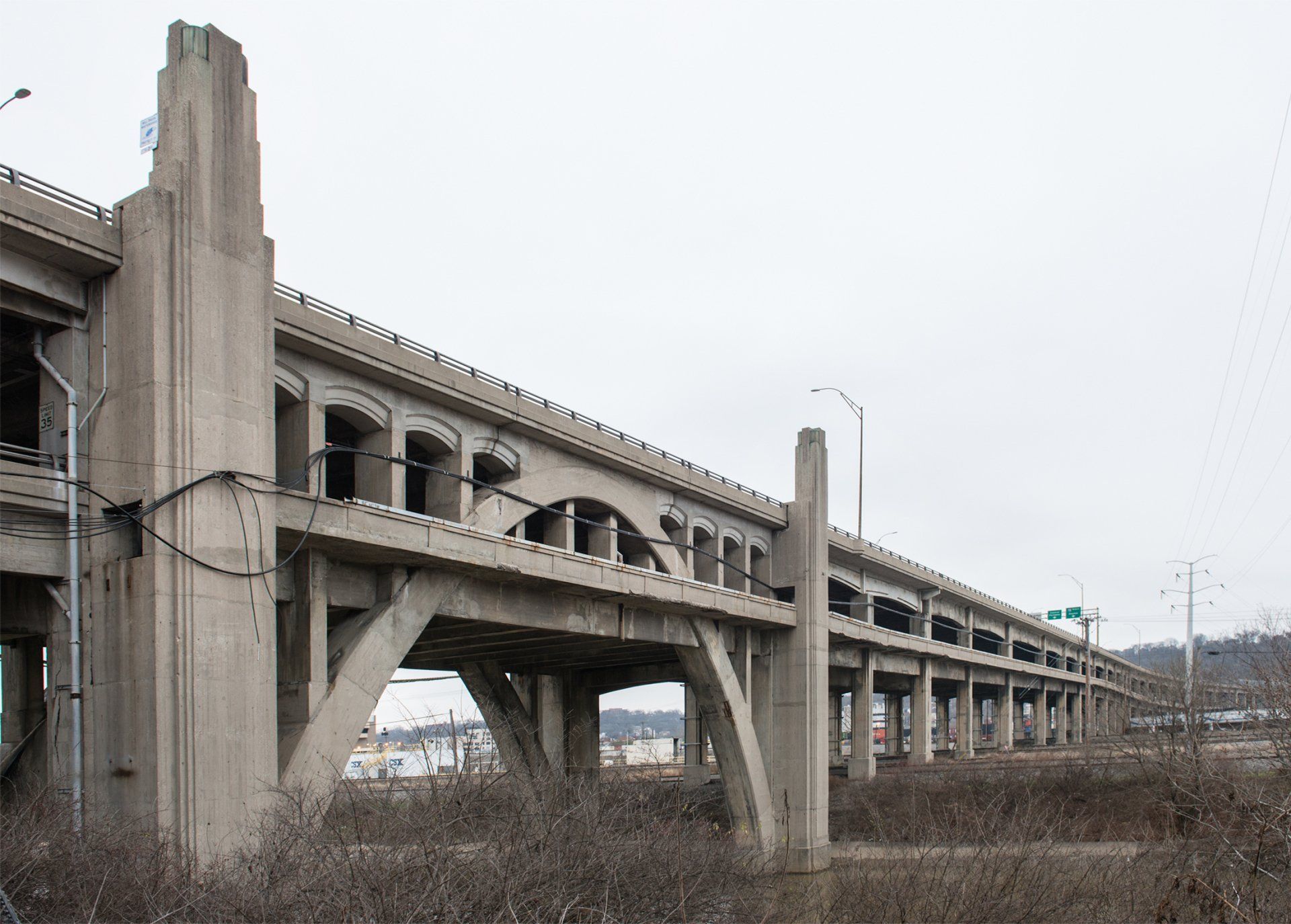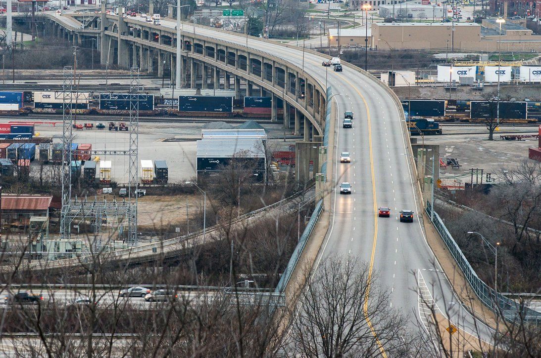 Western Hills Viaduct, a double deck, 3300 foot span across the Mill Creek valley with distinctive arch. Tall vertical piers are capped by light fixtures.