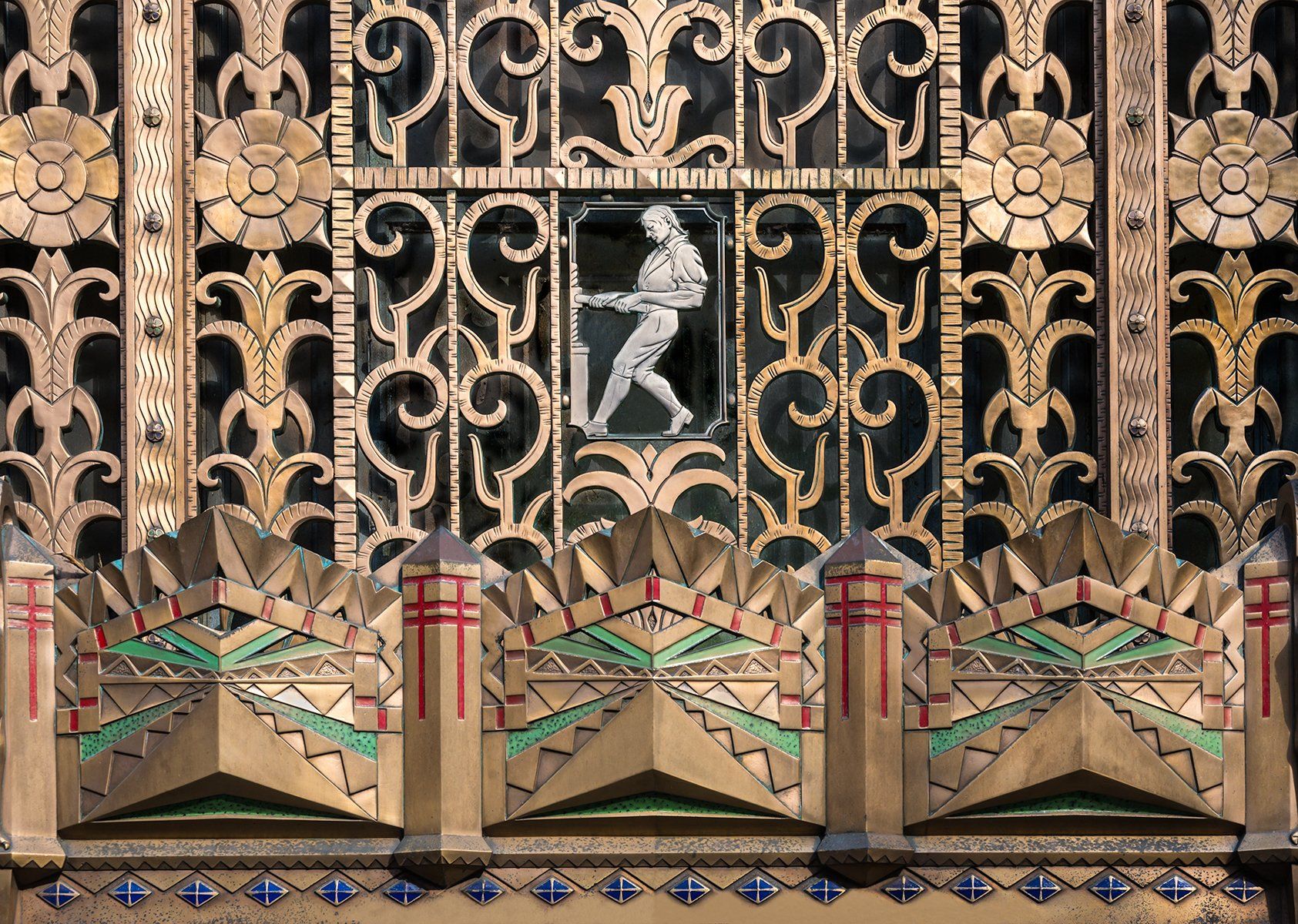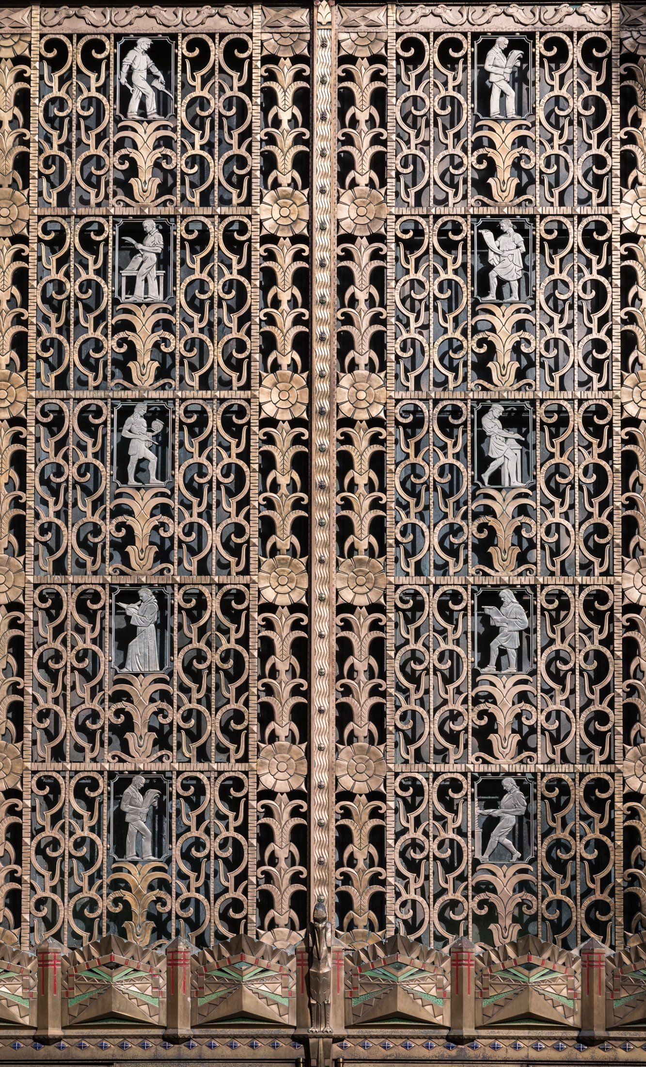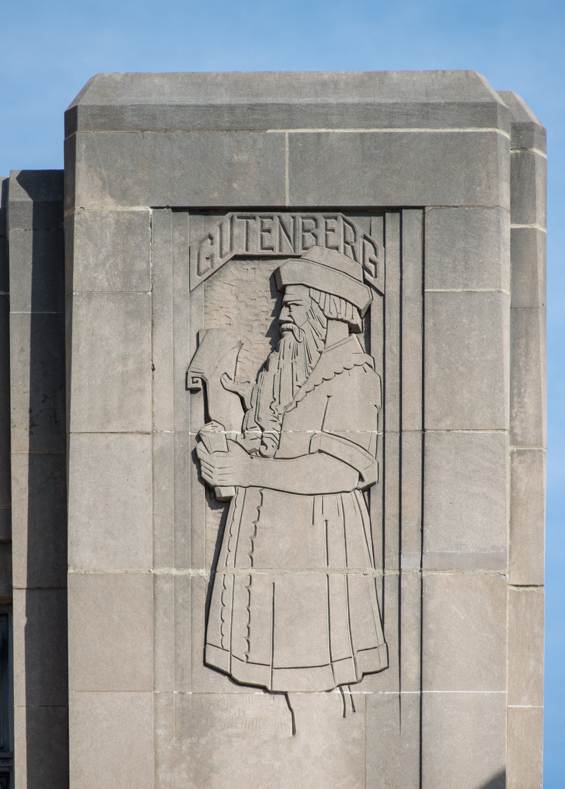 The limestone exterior is covered with carved figures from the history of printing. Legendary people are honored with huge carvings on the side facades. The intricate brass grating above the main entry displays 12 figures from this history of printing cast in nickel.
