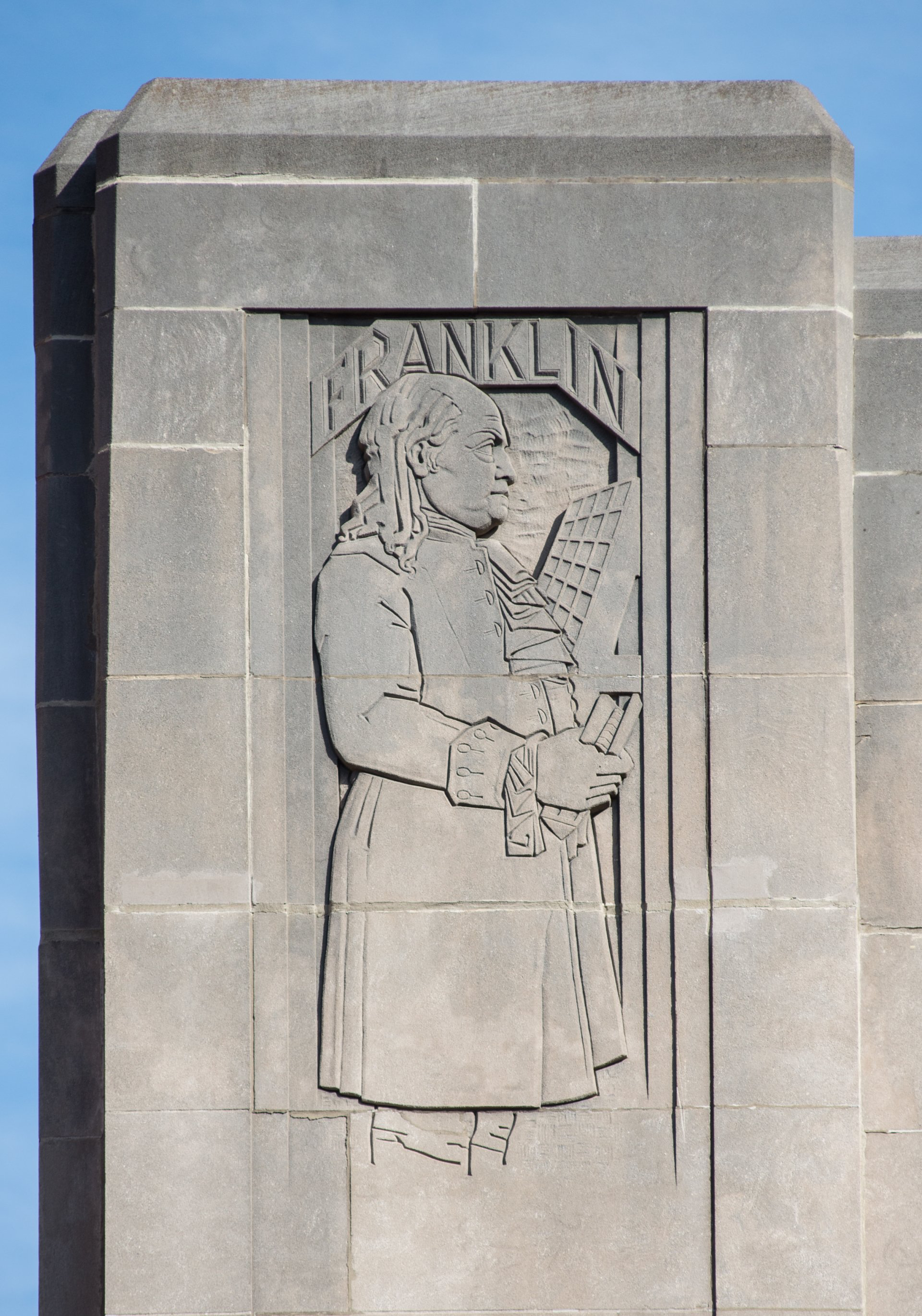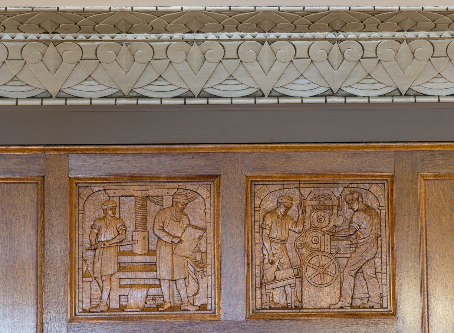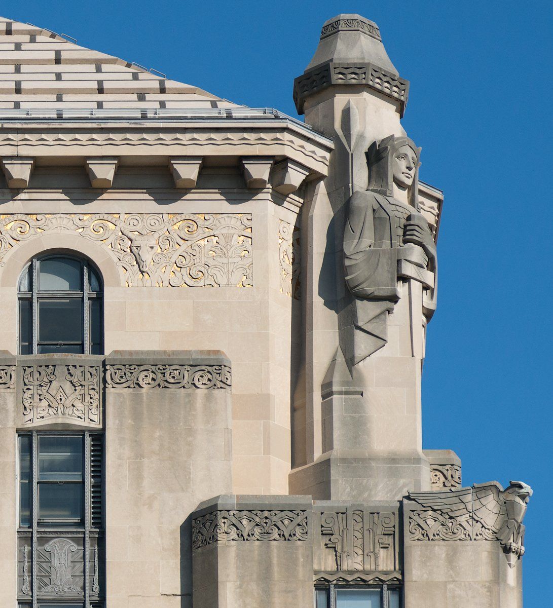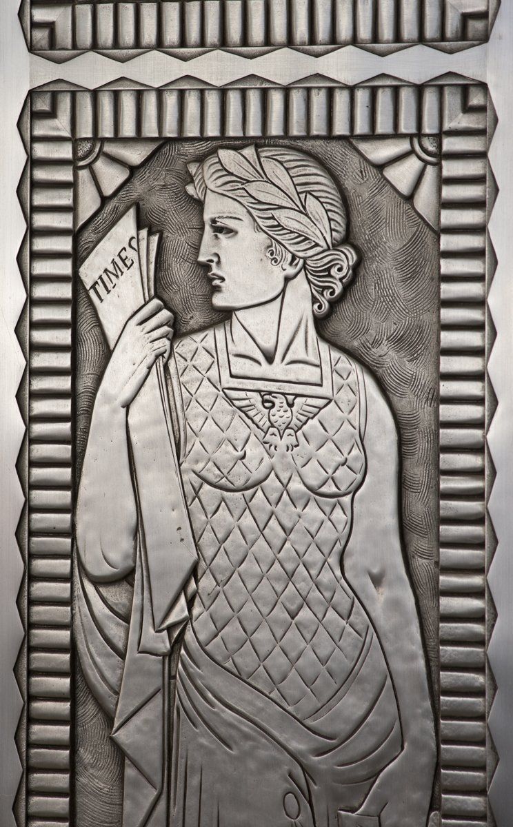 The limestone exterior is covered with carved figures from the history of printing. Legendary people are honored with huge carvings on the side facades. The intricate brass grating above the main entry displays 12 figures from this history of printing cast in nickel.