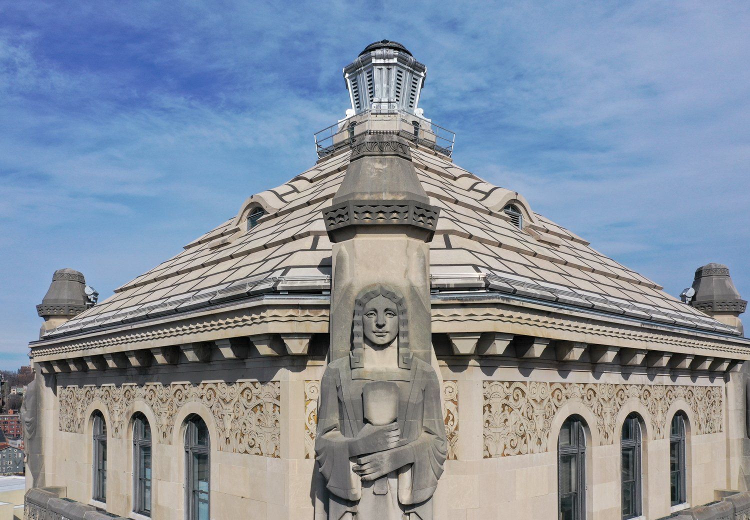 The newspaper was produced on the building’s first six floors, with the majority of the tower portion serving as office space. The figures on each corner of the tower represent virtues of the printing and publishing business: truth, progress, patriotism, and speed.