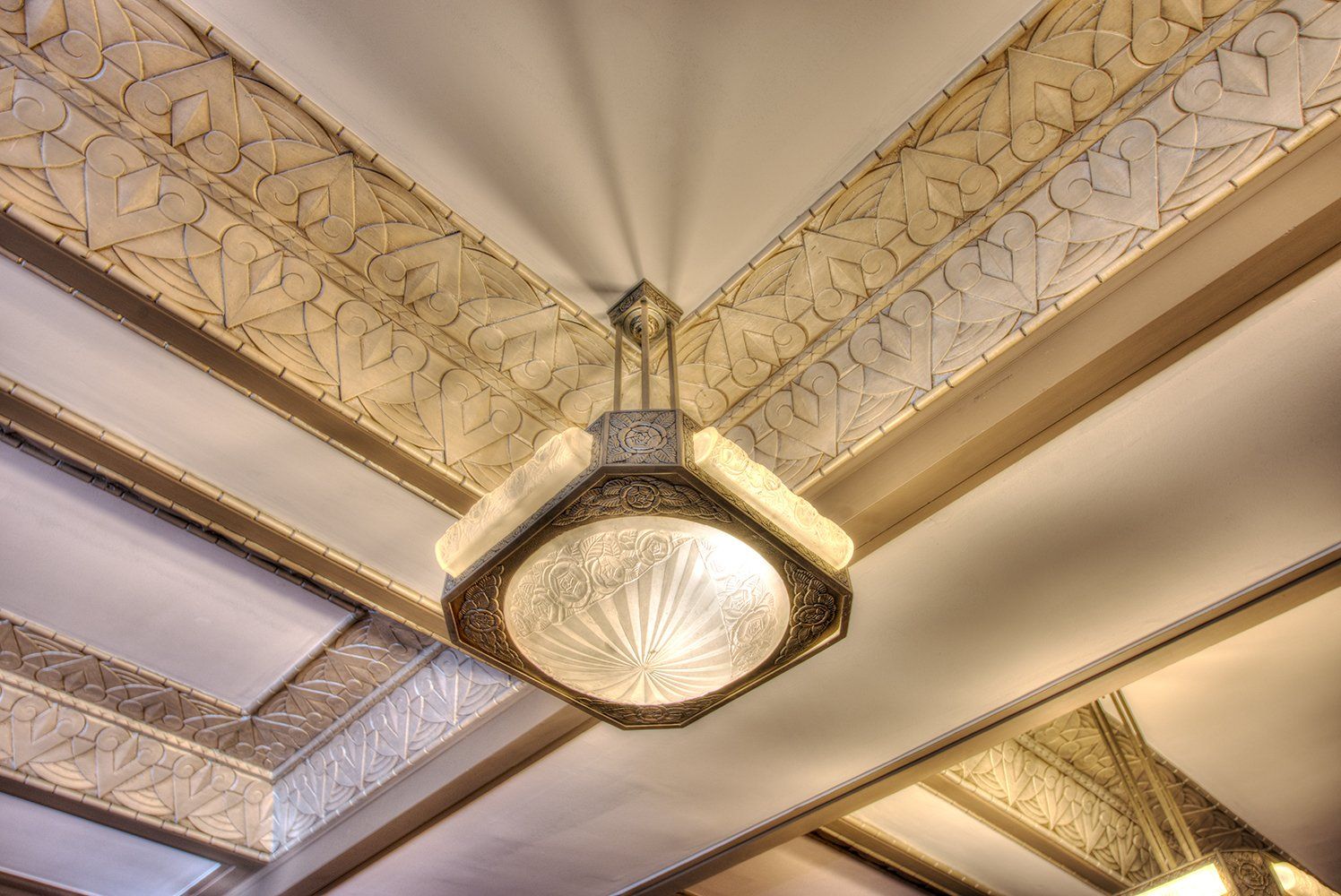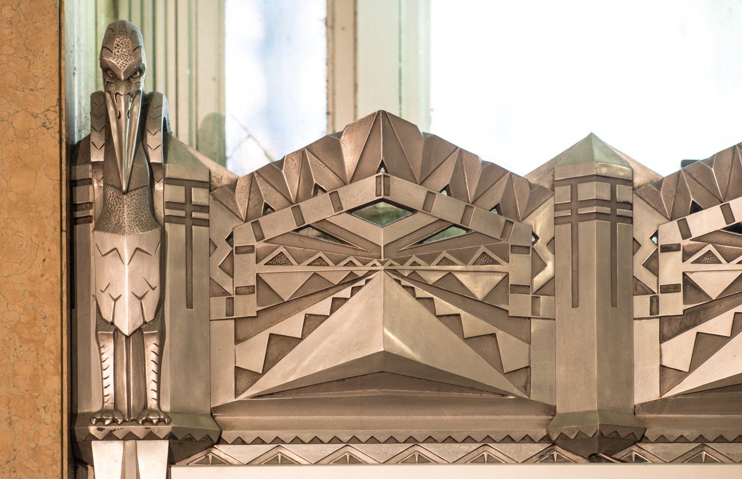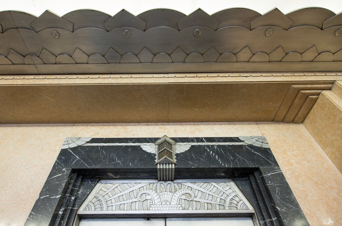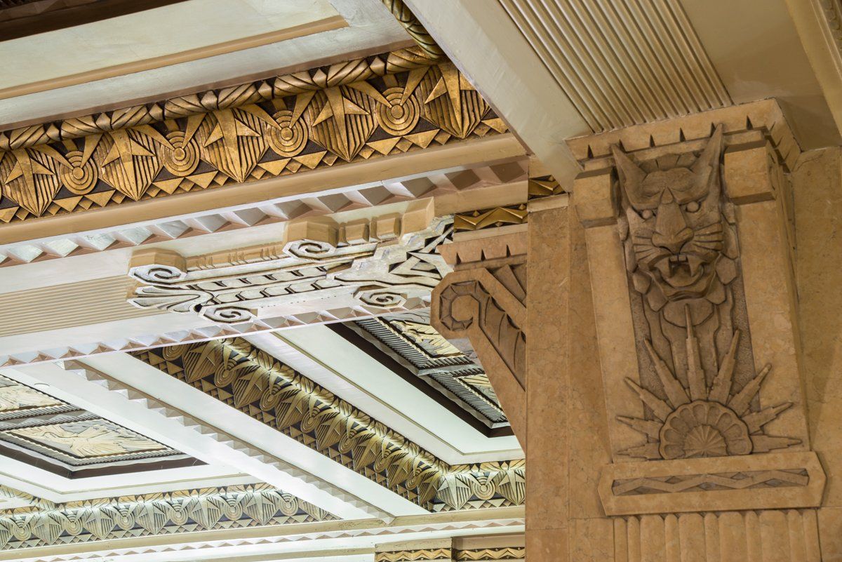 The interior features fluted marble columns with carvings of geometric patterns and animal figures. Cast nickel printers’ marks adorn the marble walls. The coffered ceiling is highly detailed, featuring geometric Deco designs in cast plaster with a gold finish and eagle medallions in the ceiling.