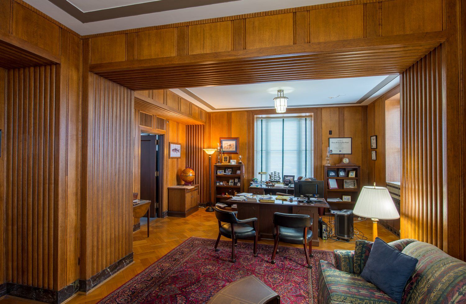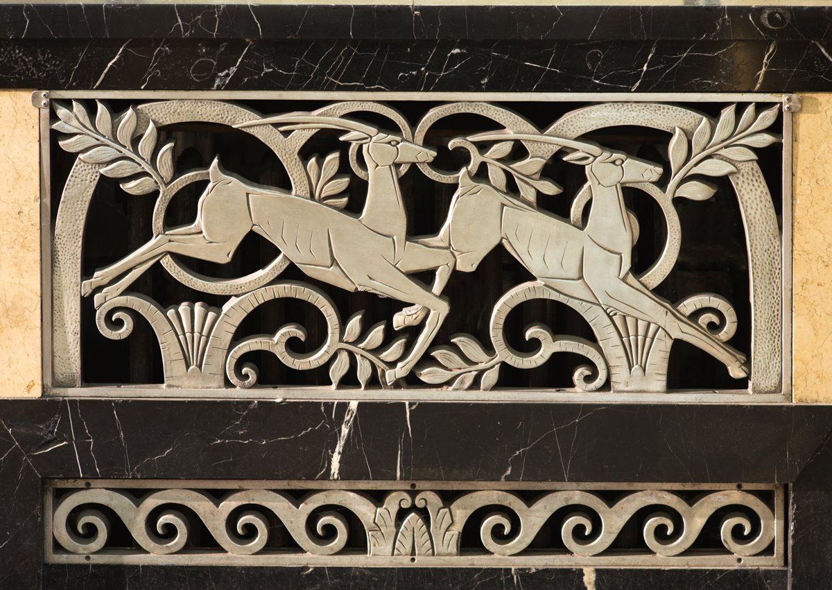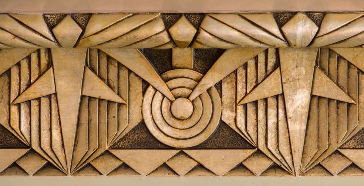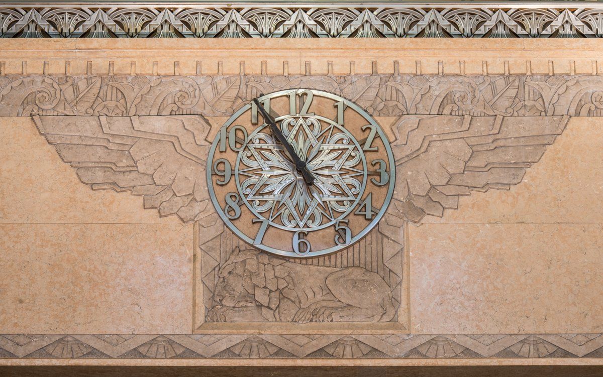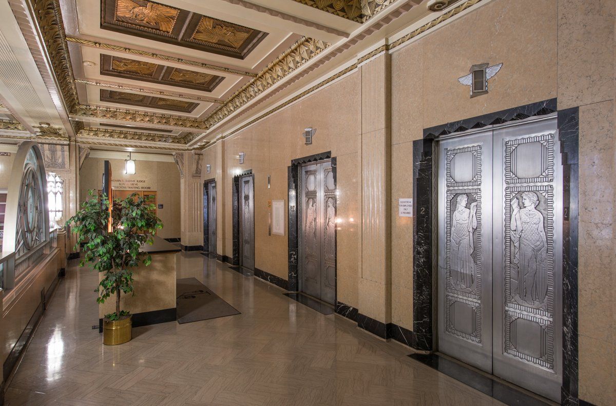 The interior features fluted marble columns with carvings of geometric patterns and animal figures. Cast nickel printers’ marks adorn the marble walls. The coffered ceiling is highly detailed, featuring geometric Deco designs in cast plaster with a gold finish and eagle medallions in the ceiling.